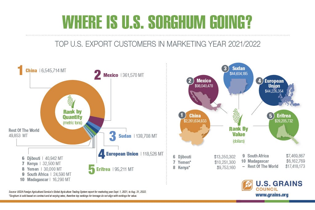 China maintained its status as the top market for U.S. sorghum in the 2021/22 marketing year (MY). Another record year of sales to the country helped total sorghum exports of more than seven million metric tons (MMT) continue into 2021/22.