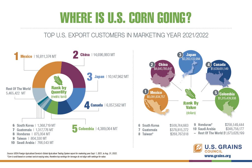 Totaling a record 16.8 million metric tons (MMT), or 662 million bushels, Mexico surpassed China as the top market for U.S. corn in the 2021/2022 marketing year. Worth $5 billion, and up eight percent from MY 2020/2021, Mexico represented 27 percent of total U.S. corn exports in MY 2021/2022.