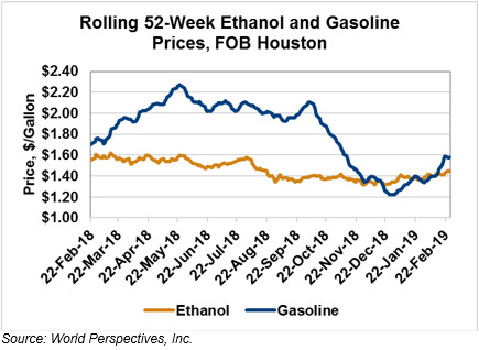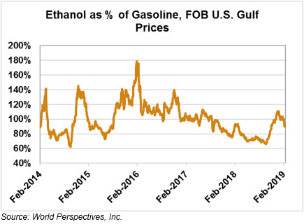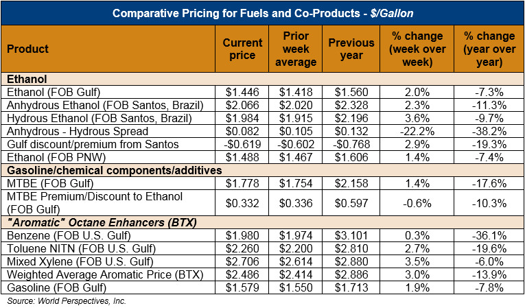 Market Outlook: U.S. ethanol prices ended last week up 1.3 percent and are up nearly 1 percent in early week trading. Midwest wholesale rack ethanol prices were up slightly to end last week; they are mostly unchanged to start this week at 38.41 cents/liter (145.39 cents/gallon) through Tuesday’s trading.