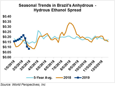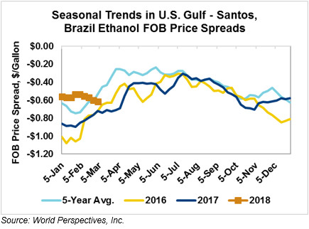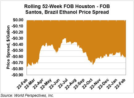 The FOB Gulf-Santos, Brazil spread widened from last week’s close through Tuesday’s trading and is currently at -16.35 cents/liter (-61.92 cents/gallon).