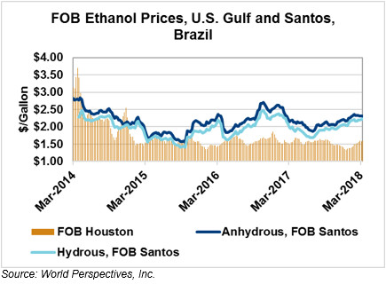 FOB Houston ethanol prices finished last week mostly unchanged; prices are up 2 percent through Tuesday’s trading from Friday’s close. FOB Houston ethanol prices are quoted at 38.20 cents/liter (144.63 cents/gallon). FOB Santos, Brazil ethanol prices ended last week up 1.4 percent; prices continue up (+2.3 percent) from Friday’s close and stand at 54.56 cents/liter (206.56 cents/gallon) through Tuesday’s trading.