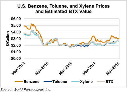 BTX component prices were up across the board to end last week and continue mostly up through Tuesday’s trading: while Benzene is unchanged, Toluene is up 2.3 percent and Xylene is up 3.4 percent. The estimated weighted average aromatic price is currently 65.51 cents/liter (247.99 cents/gallon), up from last Friday’s close. The BTX-Houston ethanol spread widened again from last week; the weighted average BTX price is 27.30 cents/liter (103.35 cents/gallon) higher than the FOB Houston ethanol price.
