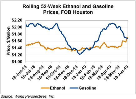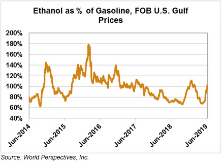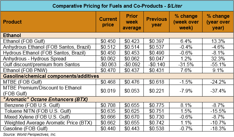 Market Outlook: U.S. ethanol prices ended last week up 9.3 percent; they have fallen back 1.2 percent in early week trading. Midwest wholesale rack ethanol prices were up 2.0 percent to end last week; they continue up this week to 45.05 cents/liter (170.53 cents/gallon) through Tuesday’s trading.