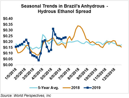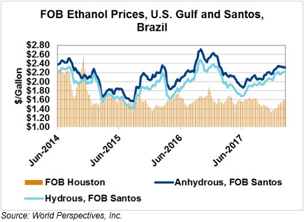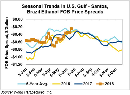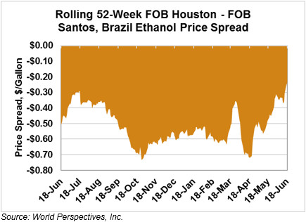 The FOB Gulf-Santos, Brazil spread narrowed from last week’s close through Tuesday’s trading and is currently at -6.27 cents/liter (-23.76 cents/gallon).