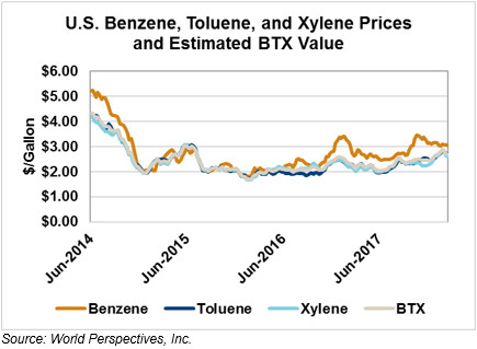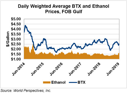 BTX component prices were mixed to end last week and continue mixed through Tuesday’s trading: Benzene is up 5.9 percent; Toluene is up 1.3 percent and Xylene is down slightly. The estimated weighted average aromatic price is currently 66.17 cents/liter (250.49 cents/gallon), up 1.0 percent from last Friday’s close. The BTX-Houston ethanol spread narrowed from last week, but the weighted average BTX price remains 21.22 cents/liter (80.33 cents/gallon) higher than the FOB Houston ethanol price.