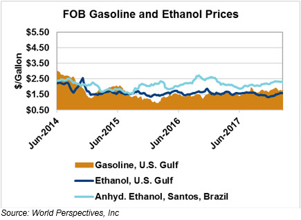 FOB Houston ethanol prices finished last week up slightly; prices are up 6.4 percent through Tuesday’s trading from Friday’s close. FOB Houston ethanol prices are quoted at 44.95 cents/liter (170.15 cents/gallon). FOB Santos, Brazil ethanol prices ended last week up 0.5 percent; they are down fractionally from Friday’s close and stand at 51.23 cents/liter (193.92 cents/gallon) through Tuesday’s trading.
