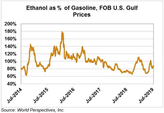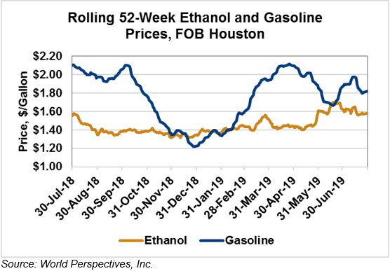 Market Outlook: U.S. ethanol prices ended last week up 1.8 percent but are down 0.6 percent in early week trading. Midwest wholesale rack ethanol prices were down 1.1 percent to end last week and have moved 0.4 percent higher through Tuesday’s market close and were last quoted at 43.80 cents/liter (165.79 cents/gallon).