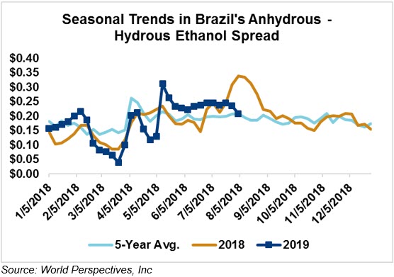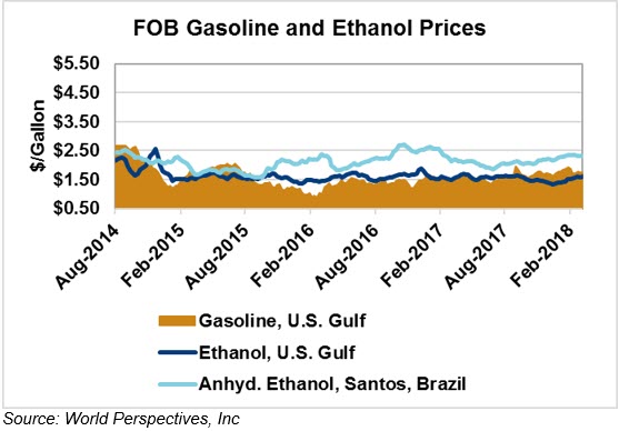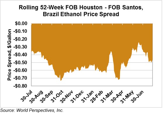 The FOB Gulf-Santos, Brazil spread narrowed from last week’s close through Tuesday’s trading and is currently at -12.203 cents/liter (-46.194 cents/gallon).