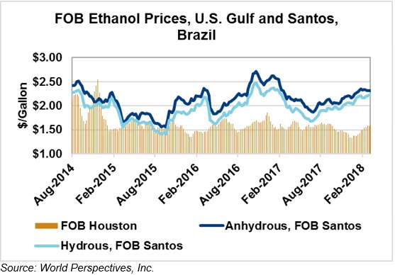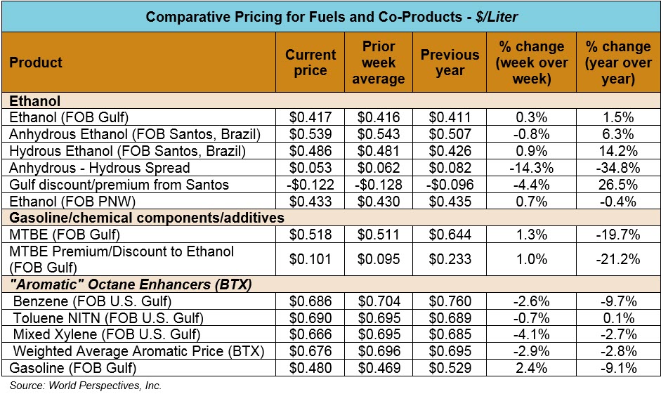 FOB Houston ethanol prices finished last week 1.3 percent lower; prices are up 0.3 percent through Tuesday’s trading from Friday’s close. FOB Houston ethanol prices are quoted at 41.701 cents/liter (157.856 cents/gallon). FOB Santos, Brazil ethanol prices ended last week up 1.0 percent; they are down slightly from Friday’s close at 53.904 cents/liter (204.05 cents/gallon) through Tuesday’s trading.