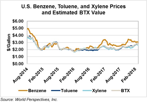 BTX component prices were lower to end last week and have continued that trend through Tuesday’s trading: Benzene is down 2.1 percent, Toluene is down 1.1 percent, and Xylene is down 4.1 percent. The estimated weighted average aromatic price is currently 67.51 cents/liter (255.56 cents/gallon), down 3.0 percent from last Friday’s close. The BTX-Houston ethanol spread narrowed from last week, and the weighted average BTX price remains 25.81 cents/liter (97.70 cents/gallon) higher than the FOB Houston ethanol price.
