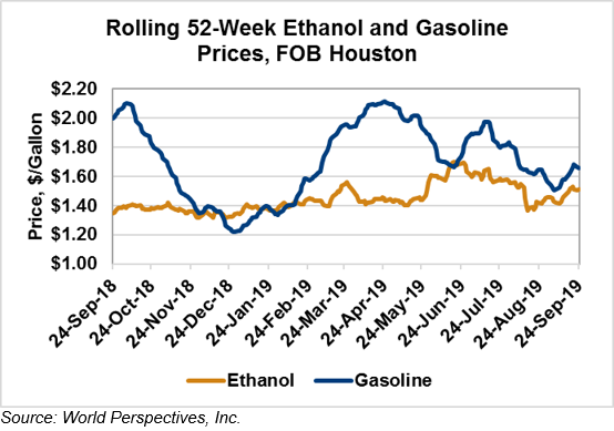 Market Outlook: U.S. ethanol prices ended last week 2.6 percent lower but are slightly higher in early week trading, up 0.7 percent through Tuesday’s close. Midwest wholesale rack ethanol prices were slightly higher to end last week and have moved 0.3 percent higher through Tuesday’s market close to their last quote of 41.21 cents/liter (155.99 cents/gallon).