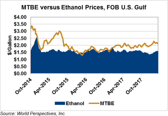 MTBE prices rose 6.2 percent last week and have extended those gains in early week trading, rising 2.1 percent from Friday’s close through Tuesday’s trading. MTBE’s premium to FOB Houston ethanol has increased from last week and stands at 12.70 cents/liter (48.09 cents/gallon).