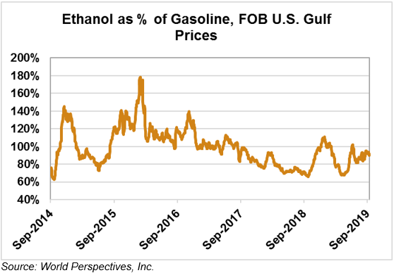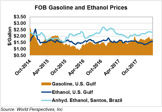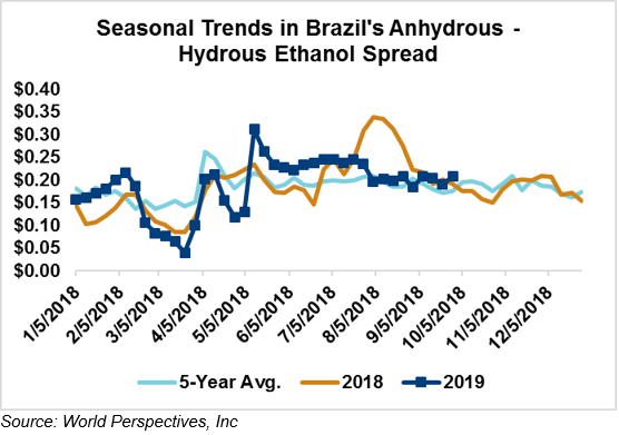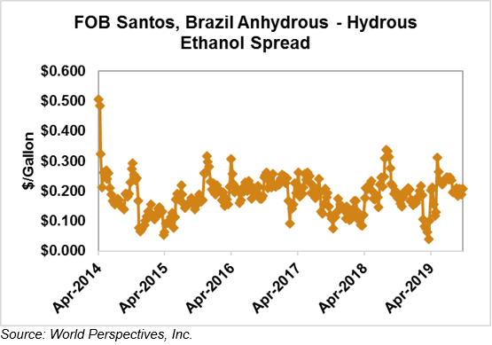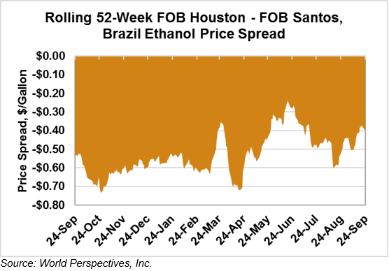 The FOB Gulf-Santos, Brazil ethanol spread widened from last week’s close through Tuesday’s trading and is currently at -10.26 cents/liter (-38.82 cents/gallon).