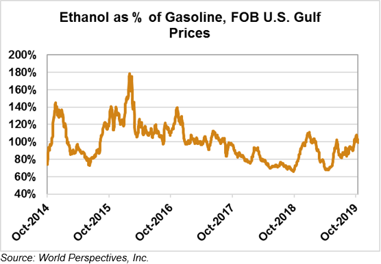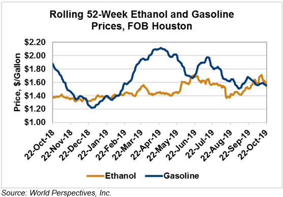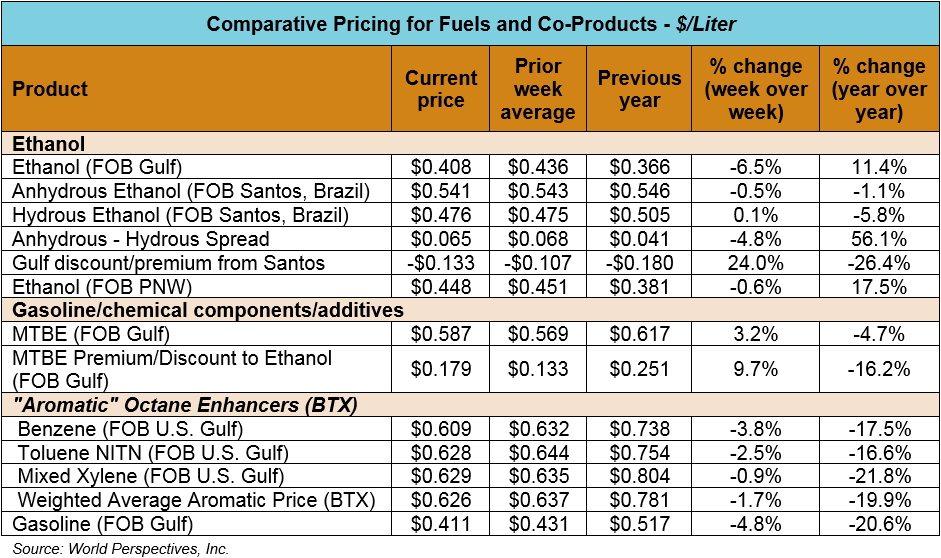 Market Outlook: U.S. ethanol prices ended last week 4.1 percent lower and have continued that trend in early week trading, down 1.1 percent through Tuesday’s close. Midwest wholesale rack ethanol prices were lower to end last week and are another 1.4 percent lower through Tuesday’s market close to their last quote of 44.38 cents/liter (167.99 cents/gallon).