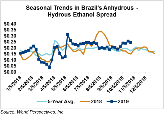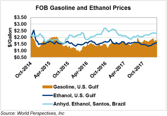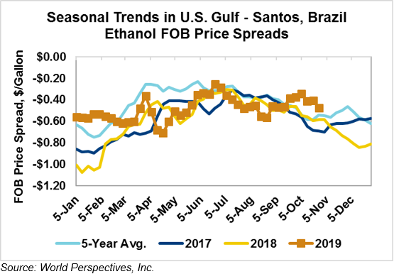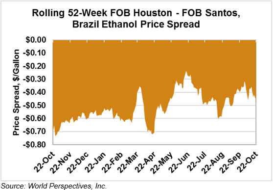 The FOB Gulf-Santos, Brazil ethanol spread widened from last week’s close through Tuesday’s trading and is currently at -13.27 cents/liter (-50.24 cents/gallon).