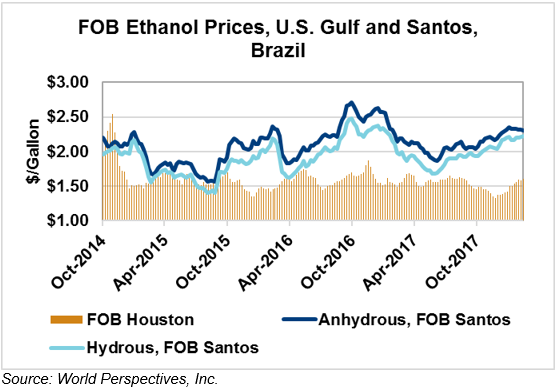 FOB Houston ethanol prices finished last week 2 percent higher but prices are down 6.5 percent through Tuesday’s trading from Friday’s close. FOB Houston ethanol prices are quoted at 40.79 cents/liter (154.41 cents/gallon). FOB Santos, Brazil ethanol prices were also higher last week; they reversed that trend this week, falling 0.5 percent to 54.06 cents/liter (204.65 cents/gallon) through Tuesday’s trading.