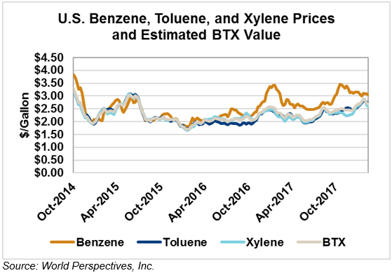 BTX component prices were mostly lower last week and have continued that trend through Tuesday’s market close: Benzene is down 3.3 percent while Toluene is down 2.3 percent and Xylene is down 0.8 percent. The estimated weighted average aromatic price is currently 62.73 cents/liter (237.47 cents/gallon), down from last Friday’s close. The BTX-Houston ethanol spread widened last week, and the weighted average BTX price is 21.94 cents/liter (83.07 cents/gallon) higher than the FOB Houston ethanol price.