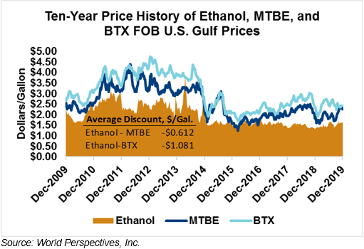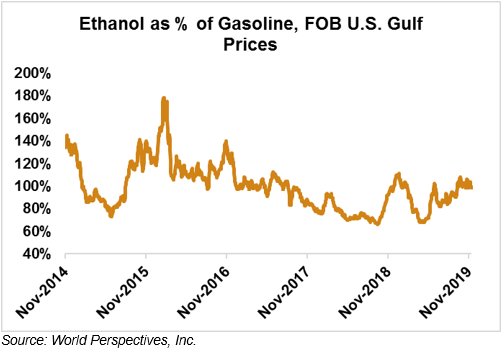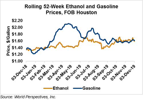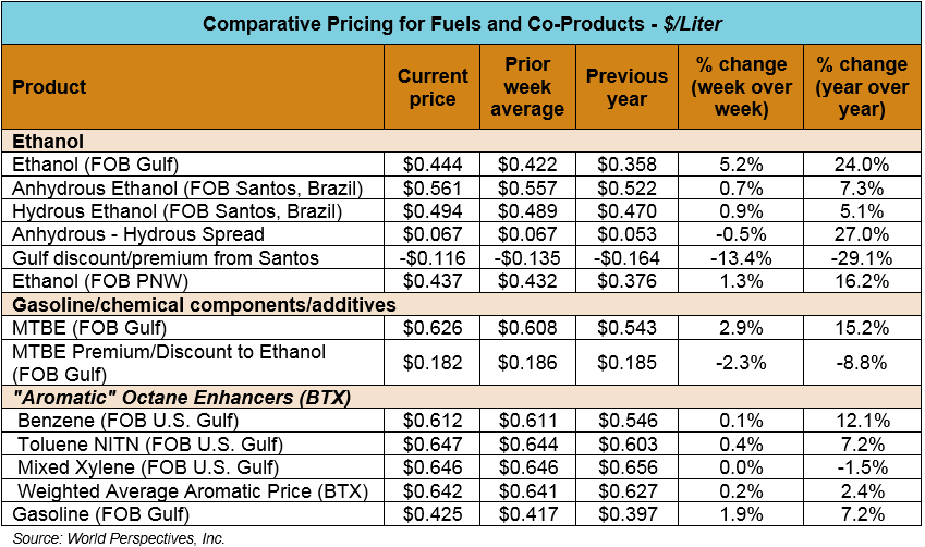Market Outlook: U.S. ethanol prices ended last week 2.4 percent lower and have extended those losses in early week trading, down 1.9 percent through Tuesday’s close. Midwest wholesale rack ethanol prices were higher to end last week but are down 1.8 percent through Tuesday’s market close to their last quote of 45.02 cents/liter (170.42 cents/gallon).
