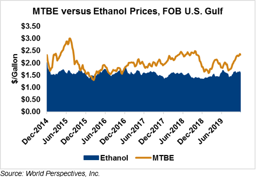 MTBE prices rose 2.8 percent last week but are lower in early week trading, down 1.2 percent from Friday’s close through Tuesday’s trading. MTBE’s premium to FOB Houston ethanol has increased from last week and stands at 19.70 cents/liter (74.58 cents/gallon).
