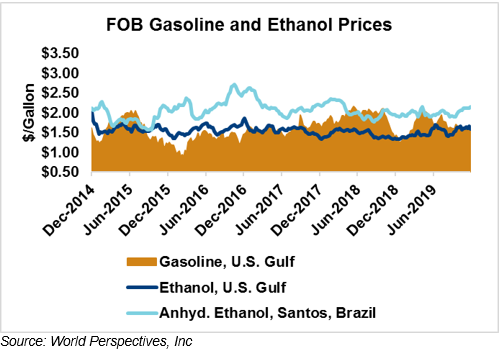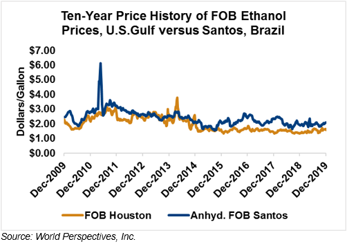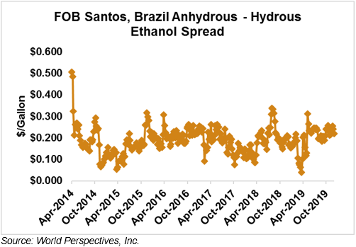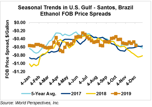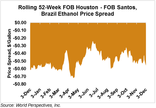The FOB Gulf-Santos, Brazil ethanol spread widened from last week’s close through Tuesday’s trading and is currently at -14.74 cents/liter (-55.79 cents/gallon).