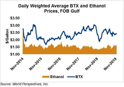 BTX component prices were mixed last week and have continued that trend through Tuesday’s market close: Benzene is up 0.4 percent while Toluene is down 0.8, and Xylene is down 1.0 percent. The estimated weighted average aromatic price is currently 63.64 cents/liter (240.92 cents/gallon), up from last Friday’s close. The BTX-Houston ethanol spread widened last week, and the weighted average BTX price is 21.62 cents/liter (81.85 cents/gallon) higher than the FOB Houston ethanol price.