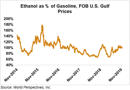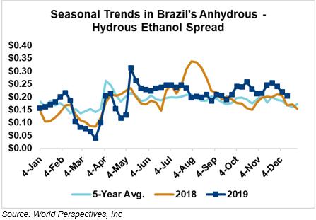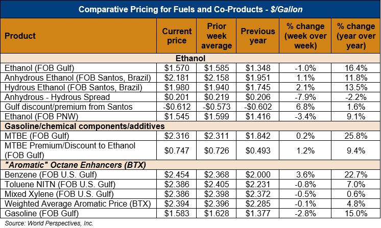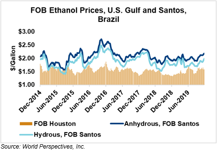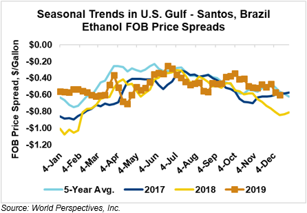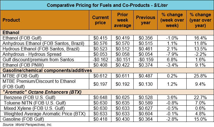 The FOB Gulf-Santos, Brazil ethanol spread widened from last week’s close through Tuesday’s trading and is currently at -16.16 cents/liter (-61.18 cents/gallon).