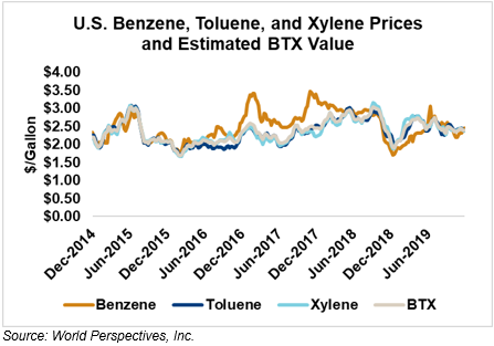 BTX component prices were mixed last week and have continued that trend through Tuesday’s market close: Benzene is up 3.4 percent while Toluene is down 0.9, and Xylene is down 0.7 percent. The estimated weighted average aromatic price is currently 63.13 cents/liter (238.97 cents/gallon), down from last Friday’s close. The BTX-Houston ethanol spread widened last week, and the weighted average BTX price is 21.67 cents/liter (82.02 cents/gallon) higher than the FOB Houston ethanol price.