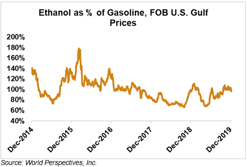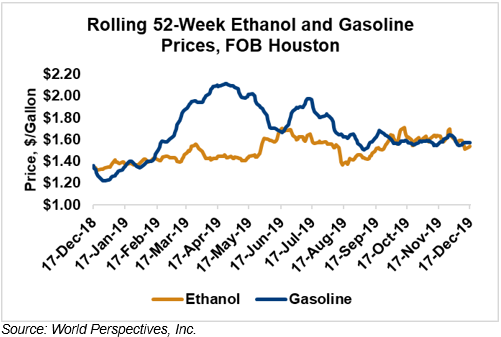 Market Outlook: U.S. ethanol prices ended last week 0.4 percent higher and have extended those gains in early week trading, up 0.1 percent through Tuesday’s close. Midwest wholesale rack ethanol prices were lower to end last week and are down 1.0 percent through Tuesday’s market close to their last quote of 41.11 cents/liter (155.60 cents/gallon).
