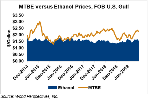 MTBE prices fell 0.8 percent last week and are lower in early week trading, down 1.6 percent from Friday’s close through Tuesday’s trading. MTBE’s premium to FOB Houston ethanol has increased from last week and stands at 18.93 cents/liter (71.67 cents/gallon).