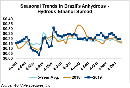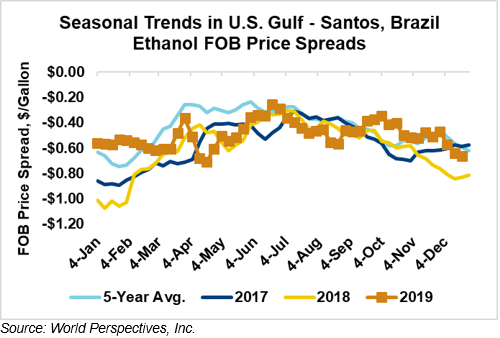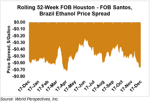 The FOB Gulf-Santos, Brazil ethanol spread widened from last week’s close through Tuesday’s trading and is currently at -17.38 cents/liter (-65.80 cents/gallon).