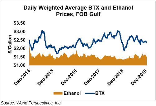 BTX component prices were mixed last week and have continued that trend through Tuesday’s market close: Benzene is up 1.1 percent while Toluene is down 1.0, and Xylene is down 1.0 percent. The estimated weighted average aromatic price is currently 62.63 cents/liter (237.08 cents/gallon), down from last Friday’s close. The BTX-Houston ethanol spread narrowed last week, and the weighted average BTX price is 21.99 cents/liter (83.26 cents/gallon) higher than the FOB Houston ethanol price.