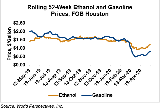 Gasoline and petroleum products were higher last week and have continued that trend in early week trading. RBOB futures are down 3.5 percent to start the week while 84 octane RBOB (Houston) and 87 octane CBOB (U.S. Gulf) gasoline prices are down 4 and 2.7 percent, respectively. WTI futures are 0.6 percent higher at $26.33/barrel while Brent futures are down 4.8 percent to $29.47/barrel, from Friday through Tuesday’s close.
