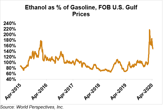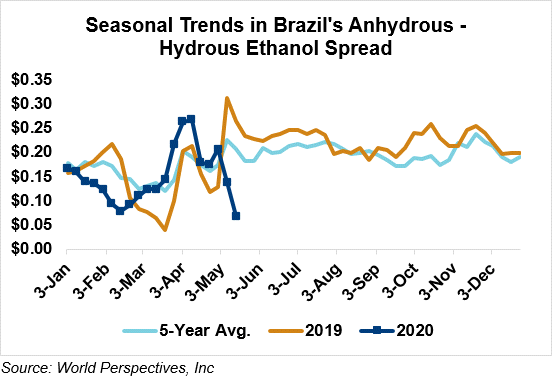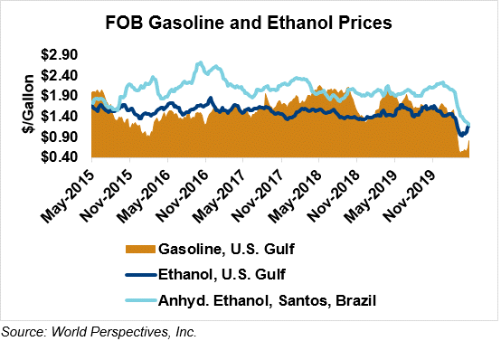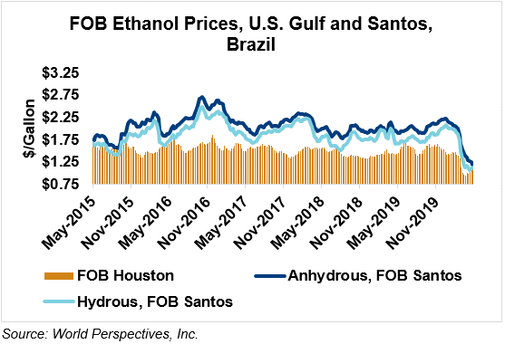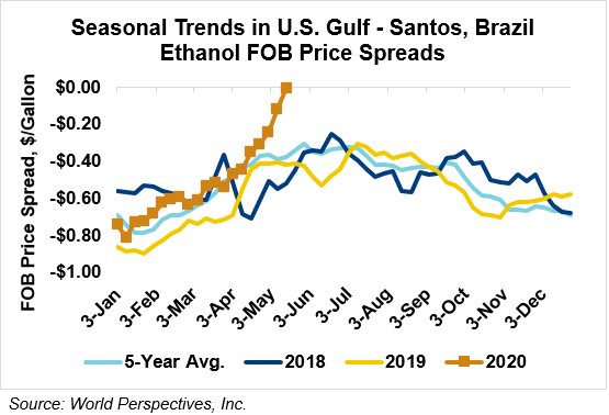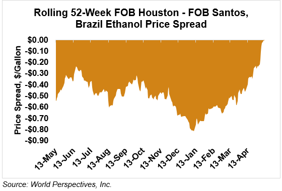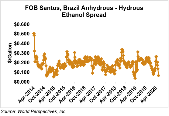 The FOB Gulf-Santos, Brazil ethanol spread has narrowed from last week’s close through Tuesday’s trading and is currently at -0.15 cents/liter (-0.55 cents/gallon).