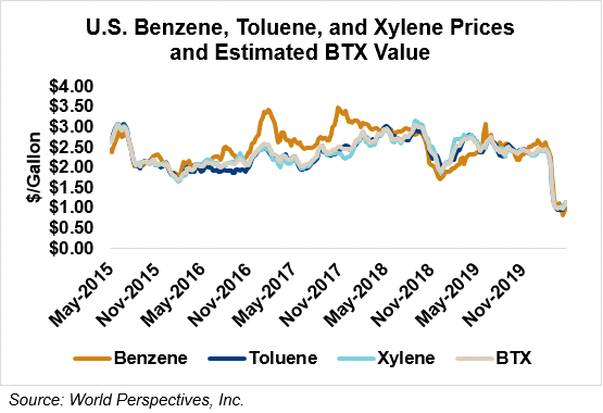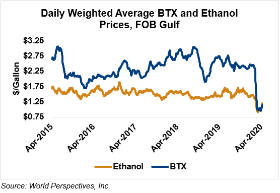BTX component prices were sharply higher last week and are higher through Tuesday’s market close: Benzene is up 10 percent while Toluene is up 9 percent, and Xylene is up 4.2 percent. The estimated weighted average aromatic price is currently 30.09 cents/liter (113.89 cents/gallon), up from last Friday’s close. The BTX-Houston ethanol spread widened last week, and the weighted average BTX price is -1.41 cents/liter (-5.36 cents/gallon) lower than the FOB Houston ethanol price.