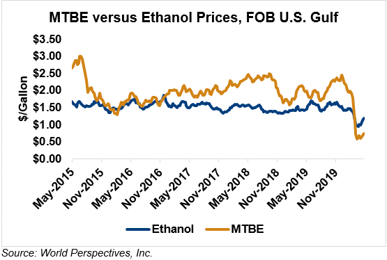 MTBE prices rose 8 percent last week and have extended those gains in early week trading, up 10.1 percent from Friday’s close through Tuesday’s trading. MTBE’s premium to FOB Houston ethanol has decreased from last week’s report and stands at -11.74 cents/liter (-44.45 cents/gallon).