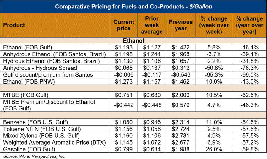 Market Outlook: U.S. ethanol prices ended last week 7.9 percent higher and are extending those gains in early week trading, up 1.5 percent through Tuesday’s close. Midwest wholesale rack ethanol prices were higher to end last week and are up 2.1 percent through Tuesday’s market close to their last quote of 33.72 cents/liter (127.64 cents/gallon).