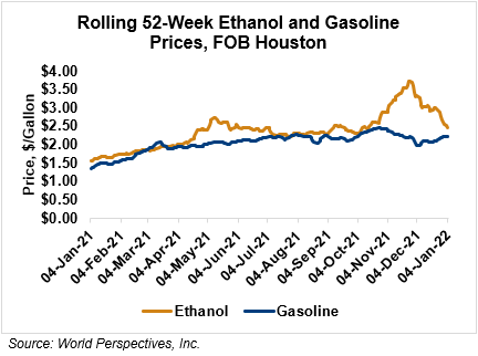 FOB Houston ethanol prices finished last week 13.1 percent lower and are down 3.6 percent through Tuesday’s trading from Friday’s close. FOB Houston ethanol prices are quoted at 64.93 cents/liter (245.79 cents/gallon). FOB Santos, Brazil anhydrous ethanol prices were higher last week; they are down in early week trading, falling 0.9 percent to 70.73 cents/liter (267.725 cents/gallon) through Tuesday’s trading.