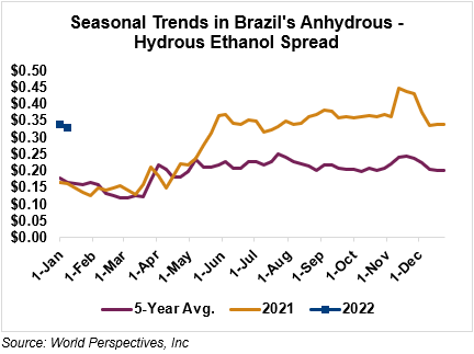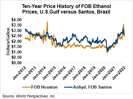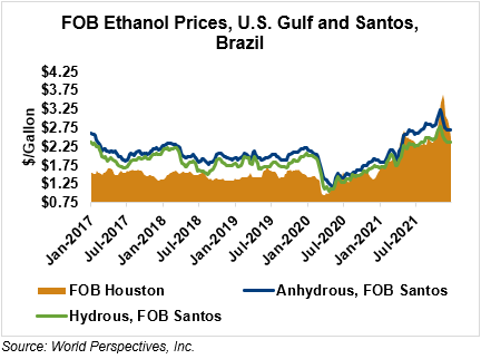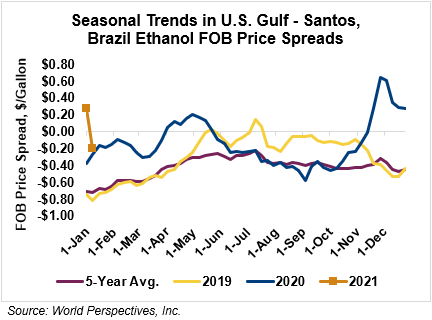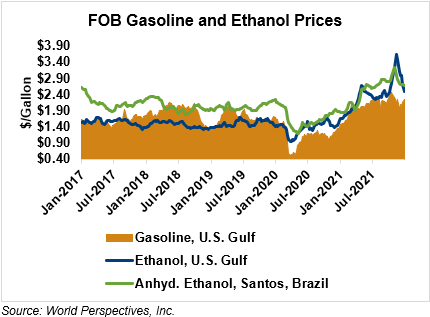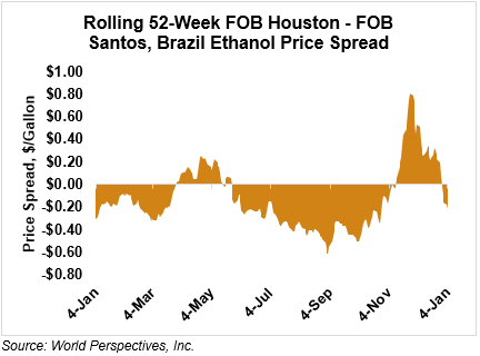 The FOB Gulf-Santos, Brazil ethanol spread has widened from last week’s close through Tuesday’s trading and is currently at -5.79 cents/liter (-21.93 cents/gallon).