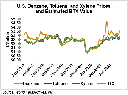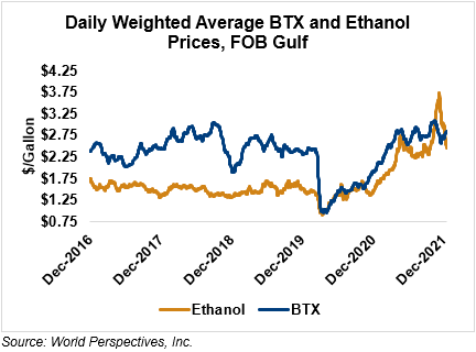 BTX component prices were sharply higher last week and are extending those gains through Tuesday’s market close: Benzene is up 2.6 percent while Toluene is up 1 percent, and Xylene is up 2.5 percent. The estimated weighted average aromatic price is currently 75.2 cents/liter (284.67 cents/gallon), up from last Friday’s close. The BTX-Houston ethanol spread widened last week, and the weighted average BTX price is 10.27 cents/liter (38.88 cents/gallon) higher than the FOB Houston ethanol price.