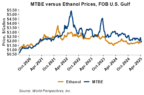 MTBE prices fell 6.7 percent last week but pared back that weakness in early week trading to gain 2.2 percent from Friday’s close through Tuesday’s trading. MTBE’s premium to FOB Houston ethanol has increased from last week’s report and stands at 1.73 cents/liter (6.55 cents/gallon).