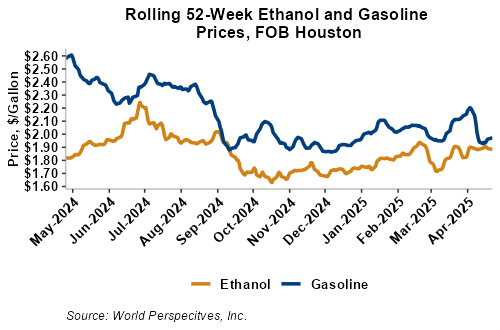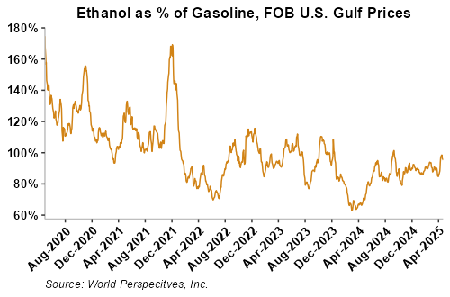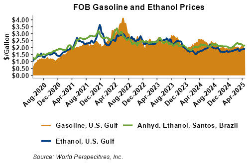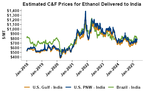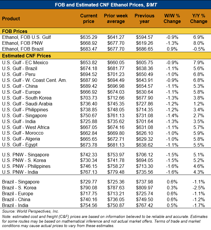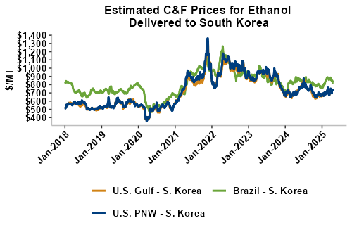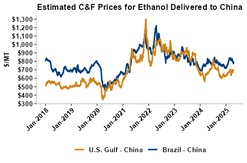 On a cost-and-freight (C&F) basis, offers are mostly lower this week as both freight rates and FOB ethanol offers have moved below last week’s values. Prices for ethanol C&F to Central America from the U.S. Gulf are down 0.9 percent this week and are up 7.2 percent from this same week in 2024. Values for PNW ethanol to Southeast Asia average $739.61/MT this week, down 1.6 percent from the prior week but up 5 percent year-over-year. That compares to U.S. Gulf to Southeast Asia C&F prices that average $731.08/MT and are down 1.3 percent from last week but are up 3.3 percent year-over-year. C&F prices for Brazilian ethanol to Southeast Asia are up 0.5 percent from last week.
