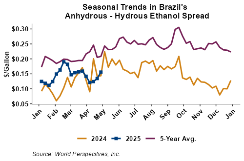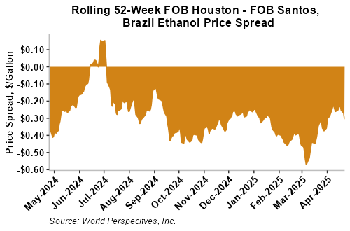 The FOB Gulf-Santos, Brazil ethanol spread has widened from last week’s close through Tuesday’s trading and is currently at -8.08 cents/liter (-30.57 cents/gallon).