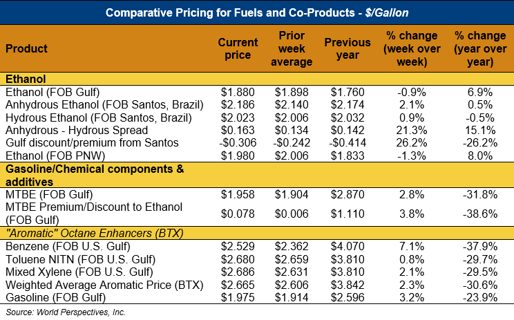 FOB Houston ethanol prices finished last week 0.3 percent higher but are down 0.5 percent through Tuesday’s trading from Friday’s close. FOB Houston ethanol prices are quoted at 49.68 cents/liter (188.05 cents/gallon). FOB Santos, Brazil anhydrous ethanol prices were higher last week; they are up in early week trading, rising 2.1 percent to 57.75 cents/liter (218.6175 cents/gallon) through Tuesday’s close.