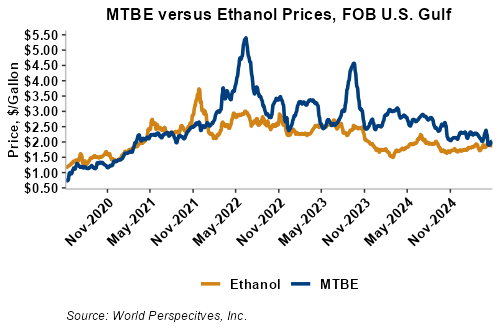 MTBE prices rose 4.1 percent last week but pared back that weakness in early week trading to gain 1.8 percent from Friday’s close through Tuesday’s trading. MTBE’s premium to FOB Houston ethanol has increased from last week’s report and stands at 2.81 cents/liter (10.64 cents/gallon).