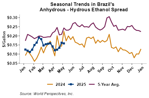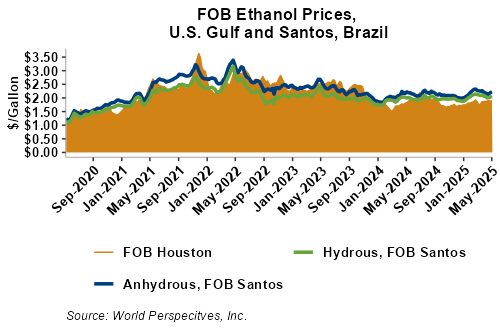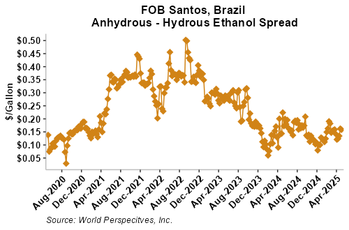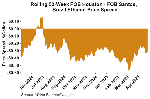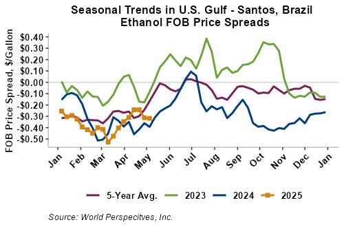 The FOB Gulf-Santos, Brazil ethanol spread has widened from last week’s close through Tuesday’s trading and is currently at -8.4 cents/liter (-31.79 cents/gallon).