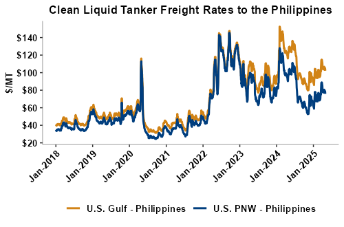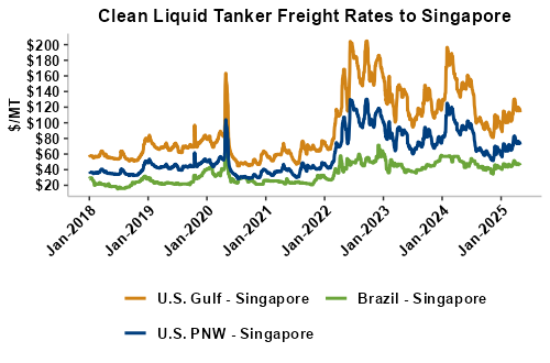 Liquid tanker rates are 3 percent lower on average this week with offers for the U.S. Gulf to Peru seeing the smallest declines (down 2 percent). Freight from the U.S. PNW to Philippines saw the largest declines and is down 4 percent from last week. On average, tanker freight from the U.S. Gulf is down 3 percent this week while freight from the PNW has posted a 4 percent decline. Liquid tanker freight rates from Brazil are down 3 percent, on average, this week. Freight rates across all origins are 5 percent lower than this same week in 2024.