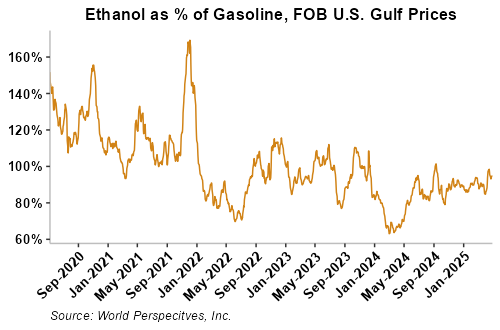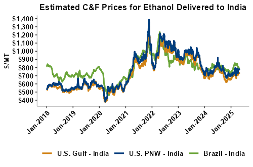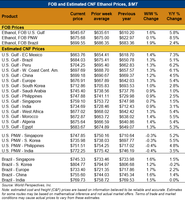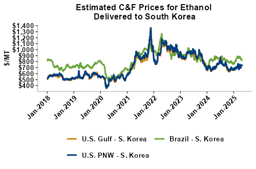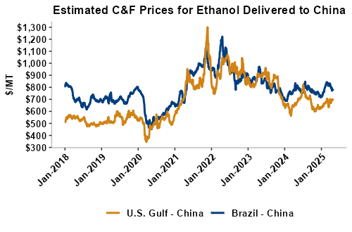 On a cost-and-freight (C&F) basis, offers are mostly higher this week as higher FOB offers for ethanol offset lower freight rates. Prices for ethanol C&F to Central America from the U.S. Gulf are up 1.3 percent this week and are up 6.5 percent from this same week in 2024. Values for PNW ethanol to Southeast Asia average $745.11/MT this week, down 0.3 percent from the prior week but up 5.2 percent year-over-year. That compares to U.S. Gulf to Southeast Asia C&F prices that average $739.95/MT and are up 0.9 percent from last week and are up 2.2 percent year-over-year. C&F prices for Brazilian ethanol to Southeast Asia are up 1.5 percent from last week.