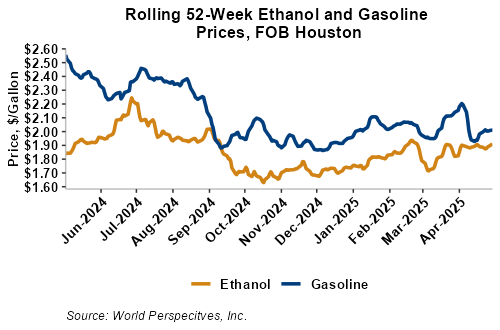 Market Outlook: U.S. ethanol prices ended last week 1.7 percent higher but were mostly steady in early week trading and fell 0.1 percent through Tuesday’s close. Midwest wholesale rack ethanol prices were higher to end last week and were up 1.2 percent through Tuesday’s market close to their last quote of 50.9 cents/liter (192.67 cents/gallon).