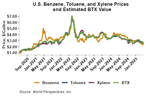 BTX component prices were sharply higher last week and saw mixed trade through Tuesday’s market close: Benzene was down 0.1 percent while Toluene was down 0.4 percent, and Xylene was up 0.9 percent. The estimated weighted average aromatic price is currently 70.84 cents/liter (268.15 cents/gallon), up from last Friday’s close. The BTX-Houston ethanol spread narrowed last week, and the weighted average BTX price is 20.35 cents/liter (77.04 cents/gallon) higher than the FOB Houston ethanol price.