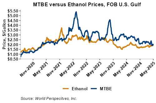 MTBE prices rose 1.4 percent last week but gave back those gains in early week trading to fall 1.6 percent from Friday’s close through Tuesday’s trading. MTBE’s premium to FOB Houston ethanol has decreased from last week’s report and stands at 2.65 cents/liter (10.05 cents/gallon).
